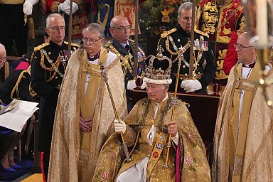 Vêtu d'une simple chemise en lin blanc, le roi avait peu avant prêté serment sur la bible puis reçu l'onction à genoux, protégé des regards par des paravents brodés, pendant que retentissait le fameux "Zadok The Priest" d'Haendel.