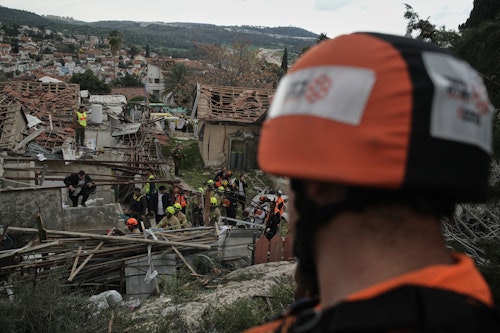 Des secouristes et des militaires interviennent sur les lieux où plusieurs personnes ont été tuées lors d'une frappe de missile iranien à Beit Shemesh, en Israël, le dimanche 1er mars 2026. (AP Photo/Leo Correa)