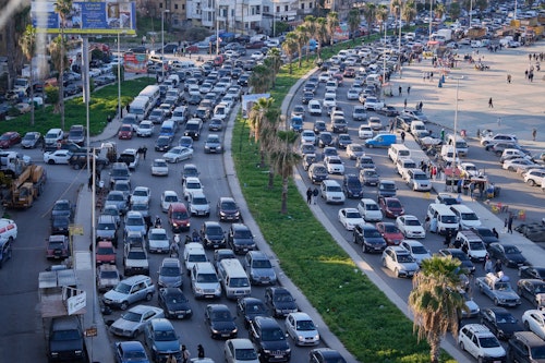 Des personnes déplacées fuyant les frappes israéliennes bloquées dans les embouteillages sur une autoroute reliant Beyrouth à la ville portuaire de Sidon, dans le sud du pays, le lundi 2 mars 2026. (AP Photo/Mohammed Zaatari)