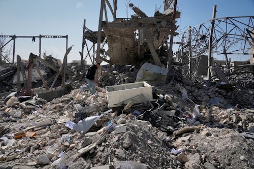 Un homme marche sur les décombres d'un bâtiment de la police frappé lors de la campagne militaire américano-israélienne à Téhéran, en Iran, le mercredi 4 mars 2026. (AP Photo/Vahid Salemi)