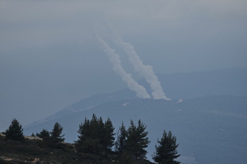 Des traînées de roquettes tirées depuis le sud du Liban en direction d'Israël sont visibles depuis le nord d'Israël, mercredi 4 mars 2026. (AP Photo/Ariel Schalit)