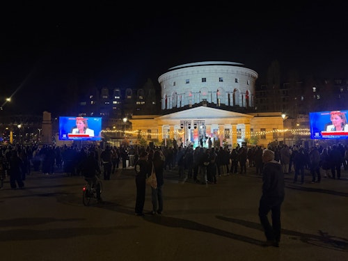 Les électeurs d'Emmanuel Grégoire rassemblés devant la Rotonde Stalingrad