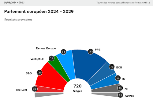 L'extrême droite progresse légèrement au niveau européen (3 députés supplémentaires pour Identité et Démocratie et 13 pour les Conservateurs et Réformistes européens), après le score historique du Rassemblement national en France, qui a récolté 31 % des suffrages dans l'Hexagone.